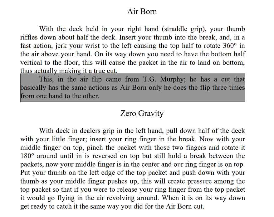 See these explanations of Zero Gravity and Air Born from Artifice, Ruse, and Subterfuge in the Hands: