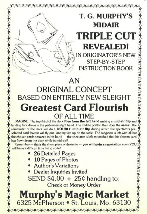 The deck flip is a move originally published by St. Louis magician T.G. Murphy in 1976. He shared it in a pamphlet entitled The Triple Cut, as it was used in this three-packet cut of his. This instructional was promoted by him by placing advertisements in various magic magazines, such as the one seen here: