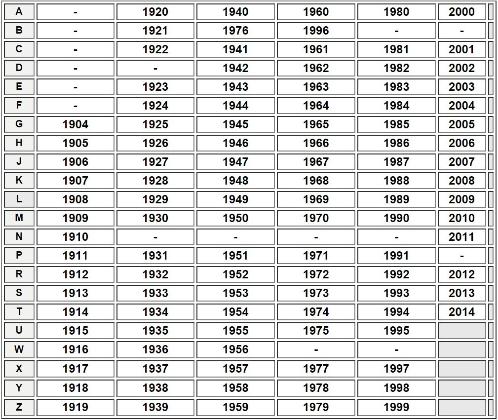 The first letter of the code corresponds to the year printed, in accordance with this index below: